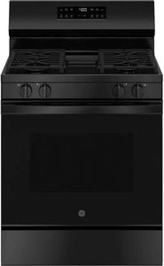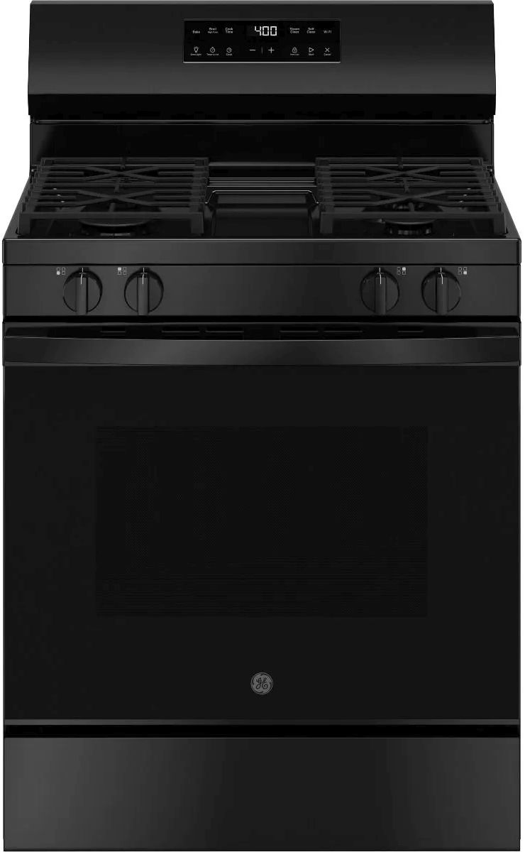 GE® 400 Series 30" Black Freestanding Gas Range features SmartHQ™ Pro, 15,000 BTU Power Boil Burner, Precise Simmer Burner, Self-Clean with Steam Clean, Oven Storage Drawer, Heavy Duty, Dishwasher-Safe Grates and Large Capacity Oven.Read More