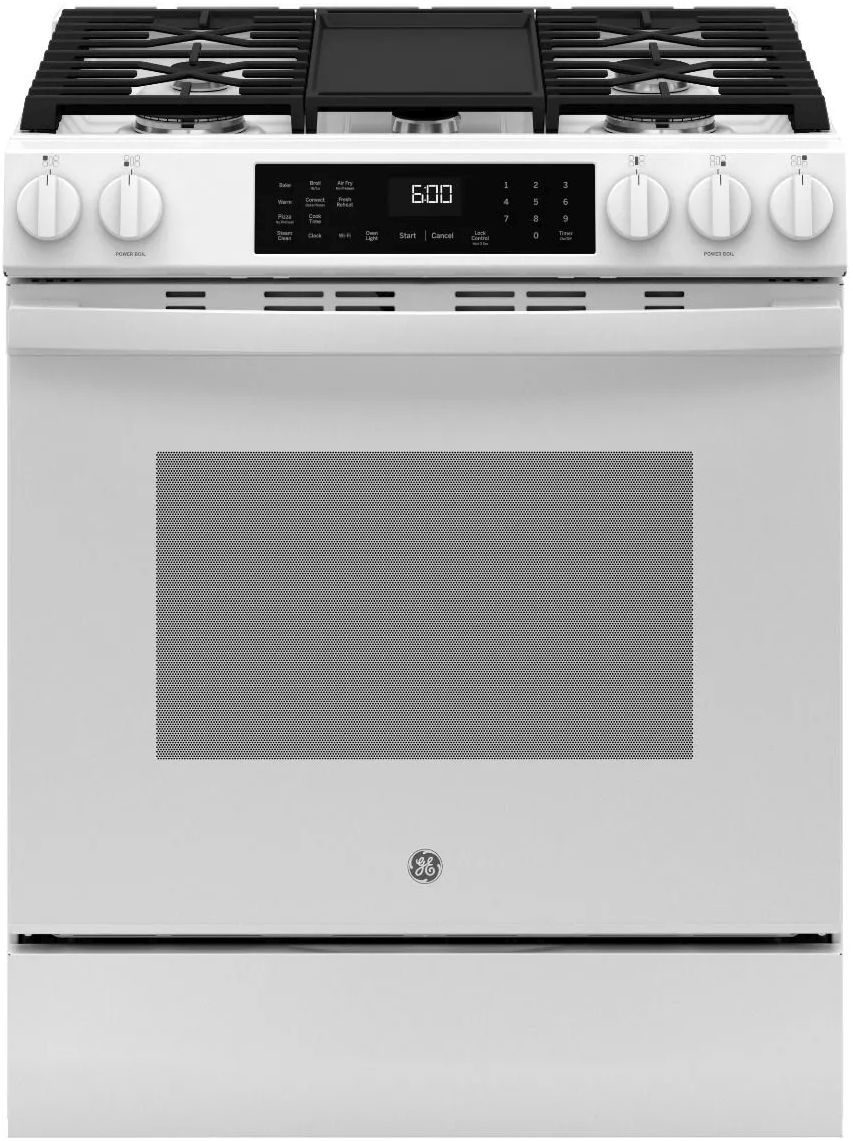 GE® 600 Series 30" White Slide-In Gas Range features EasyWash™ Oven Tray, Built-In WiFi, No Preheat Air Fry, Express Preheat, Edge-to-Edge Cooktop, Precise Simmer Burner, Center Oval Burner, Heavy-Duty, Dishwasher-Safe Grates, and Convection.Read More