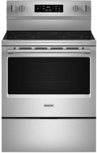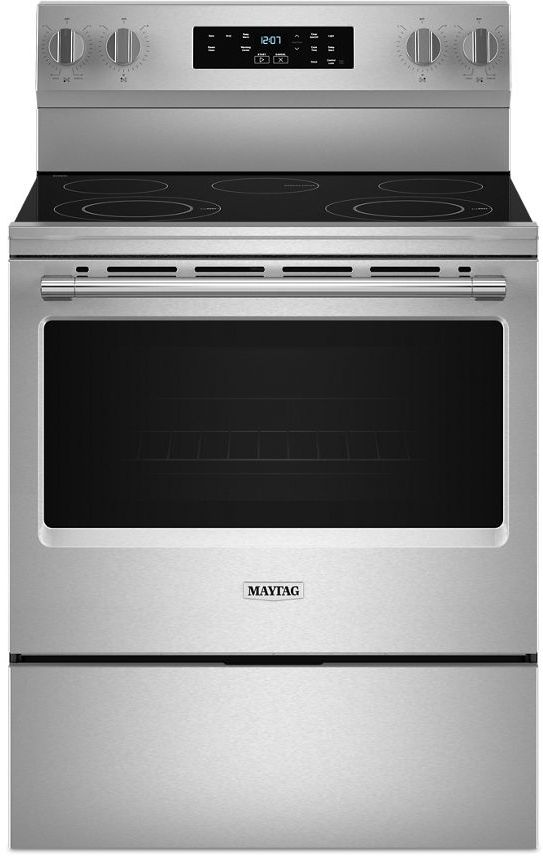 Sturdy door hinges on this Maytag® electric range are built for dependability, while the fingerprint resistant stainless finish and ceramic glass cooktop help make cleaning easy.